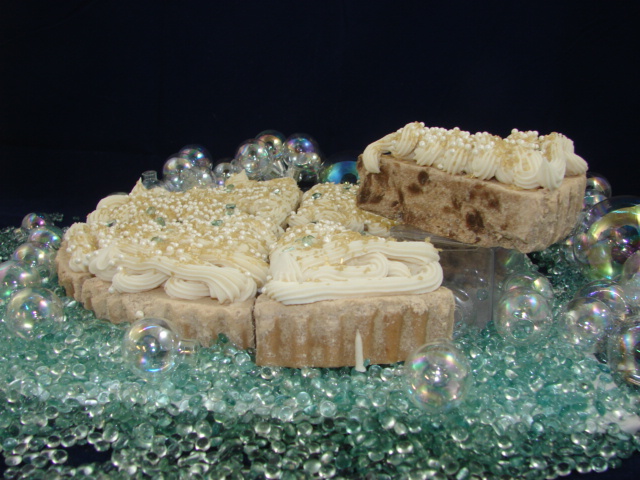 Topped with pipped goat milk soap and sugar pearls and golden sugar flakes (do NOT EAT these decorations), this soap pie looks as luxurious as you’ll feel after soaking in a tepid bath.
