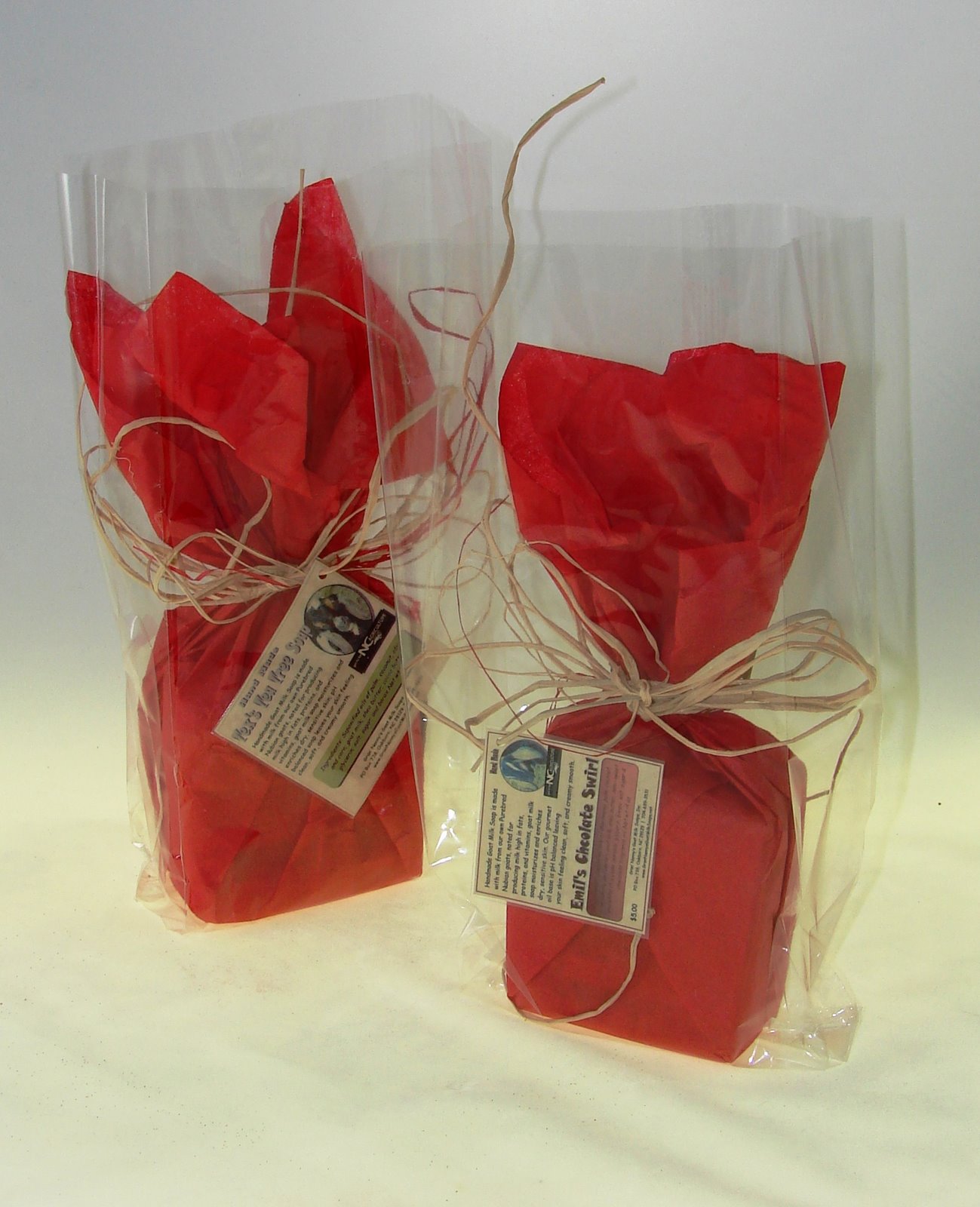Pictured is our signature cello packaging design. Goat Milk Soaps are wrapped with red or cream colored tissue paper then tied with natural raffia.