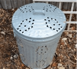 - Pros: Compact, secure, inexpensive, easy to create from metal or plastic trash can, holes allow for circulation/drainage,